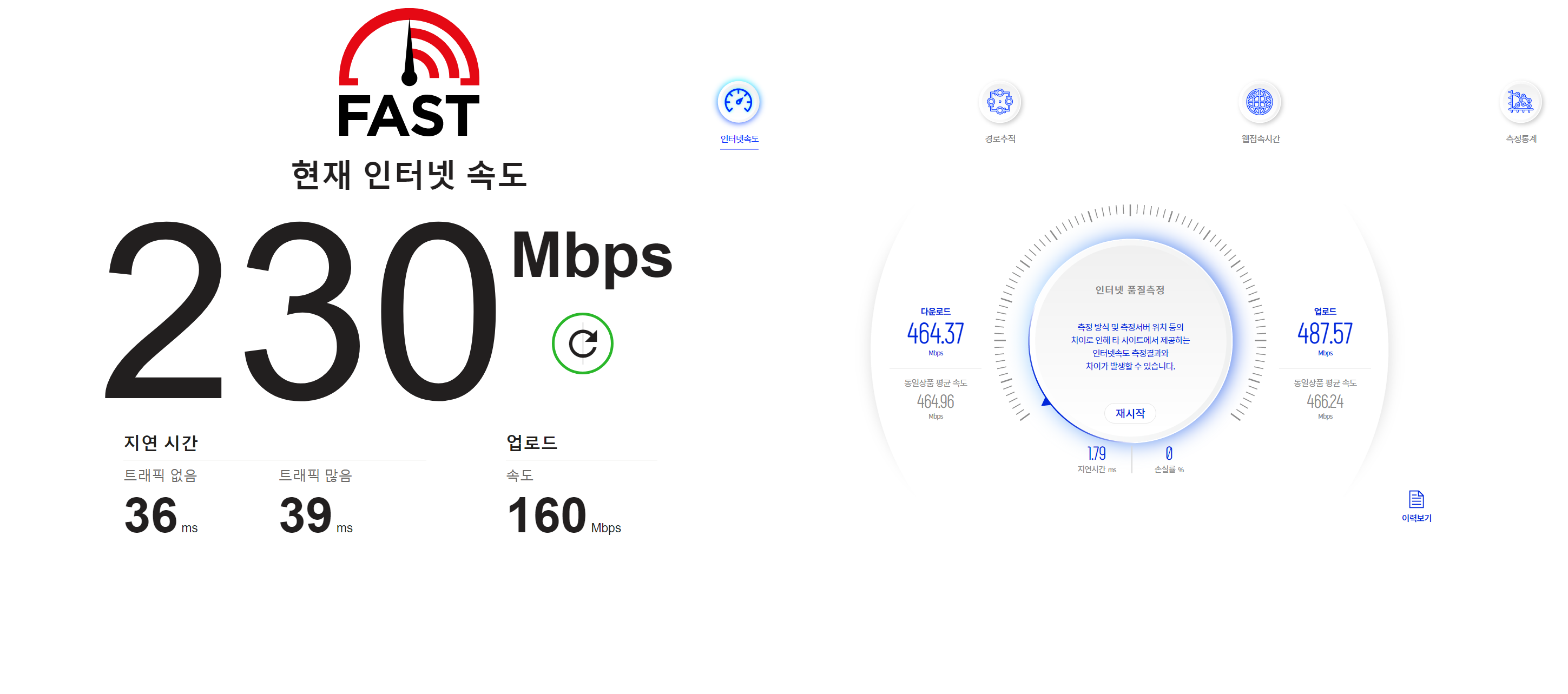 - Speedtest.net, Fast.com 등의 웹사이트에서 인터넷 속도를 측정합니다.