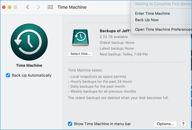 - 시스템 설정 > Time Machine에서 백업 디스크 설정 확인.