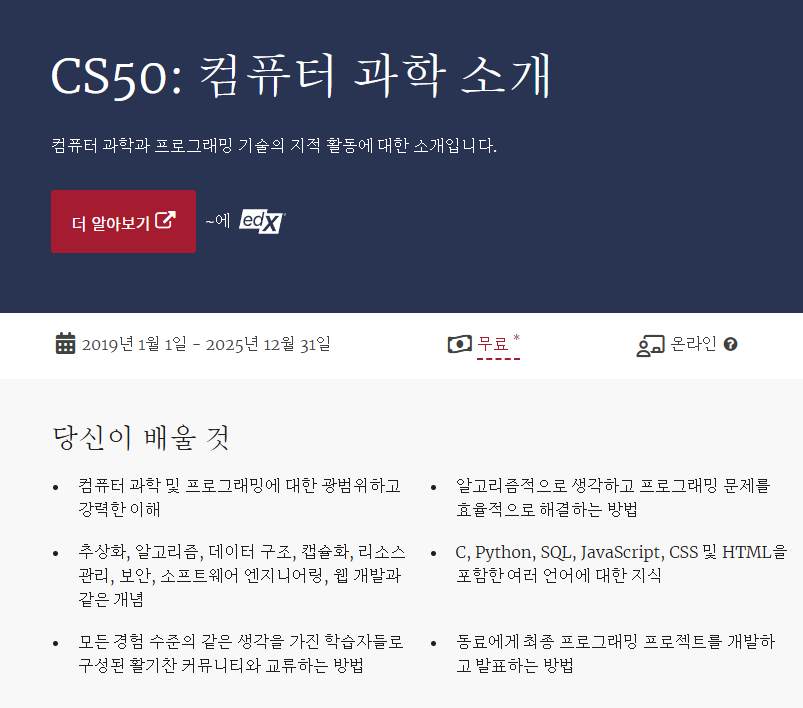 - Harvard 대학의 유명한 컴퓨터 과학 입문 강좌.