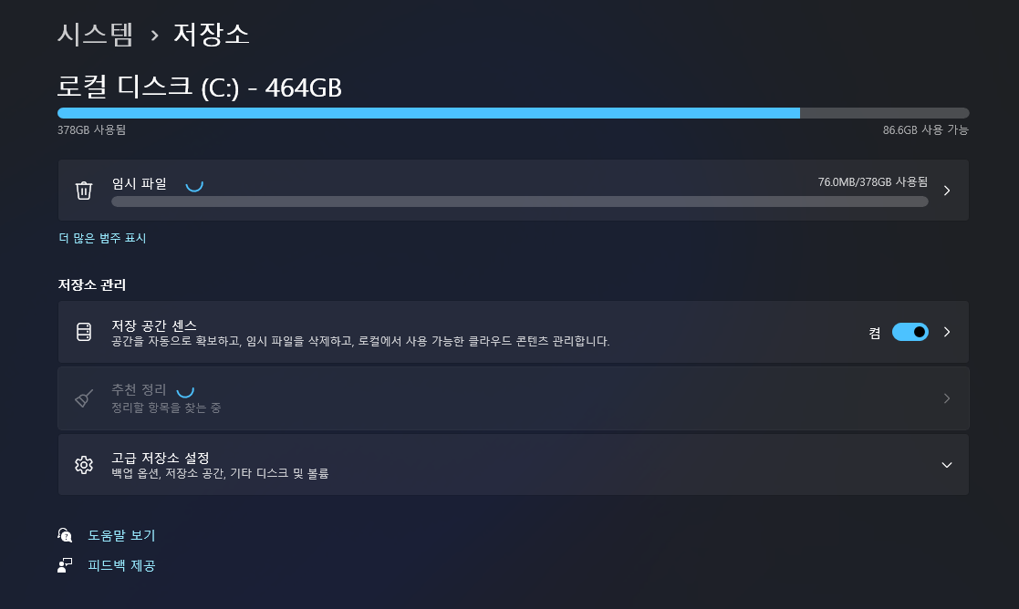 - "저장소 센스" 활성화 및 정리 주기 설정.