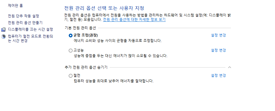 - "추가 전원 설정" 클릭 후 "균형 조정" 또는 "절전 모드" 선택.
